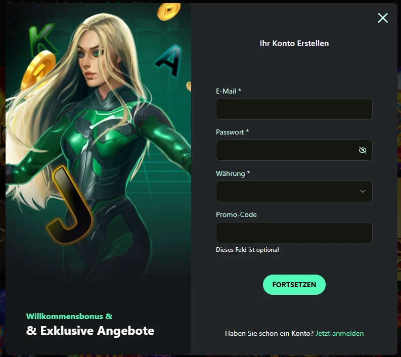 Klicken Sie auf „Registrieren“, um unser Kontoerstellungsformular zu öffnen. Sie beginnen mit der Eingabe Ihrer E-Mail-Adresse, wählen ein sicheres Passwort und entscheiden sich für Ihre Währung. Falls Sie einen Promo-Code haben, können Sie diesen hier hinzufügen—dies ist aber optional, Sie können auch einfach weitermachen.