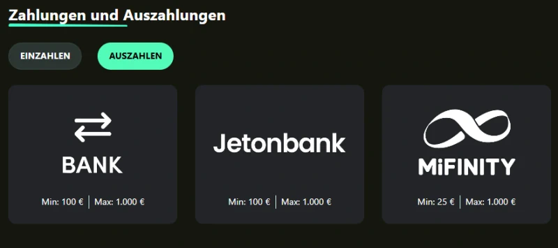 E-Wallet-ähnliche Optionen (MiFinity, Jetonbank, Jeton Cash) für Tempo und Flexibilität.