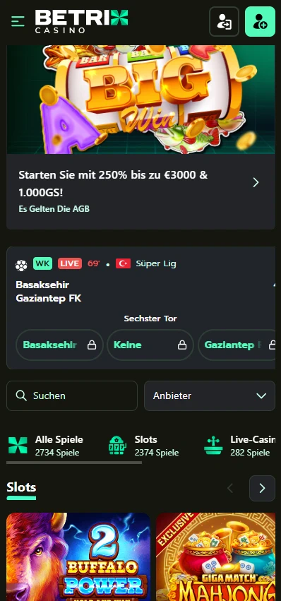 Auf Betrix mobil erhalten Sie weiterhin eine riesige Lobby mit über 3.500 Spielen aus den Bereichen Slots und Tische, ein Live-Casino mit echten Dealern sowie ein integriertes Sportwettenangebot mit Funktionen wie Bet Builder, Early Payout und wechselnden Boost-Specials. Alles Wichtige bleibt zugänglich, einschließlich Aktionen, Banking und Kontoeinstellungen, sodass sich das mobile Spielen niemals wie eine „Lite“-Version der Webseite anfühlt.